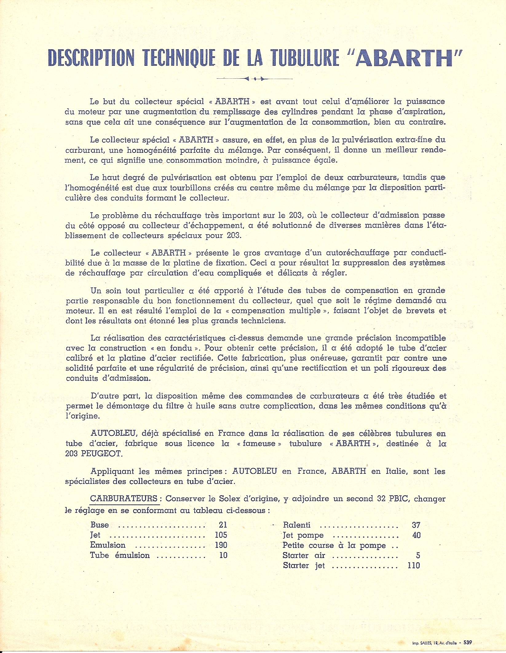 La marque Abarth, immanquablement associée au constructeur automobile Fiat, a produit des éléments mécaniques destinés à augmenter les performances de nombreuses automobiles. La 203 n'y a pas échappé, et une gamme de lignes d'échappement ou de tubulures d'admission lui était dédiée. Ces accessoires étaient fabriqués pour la France par la société Autobleu.