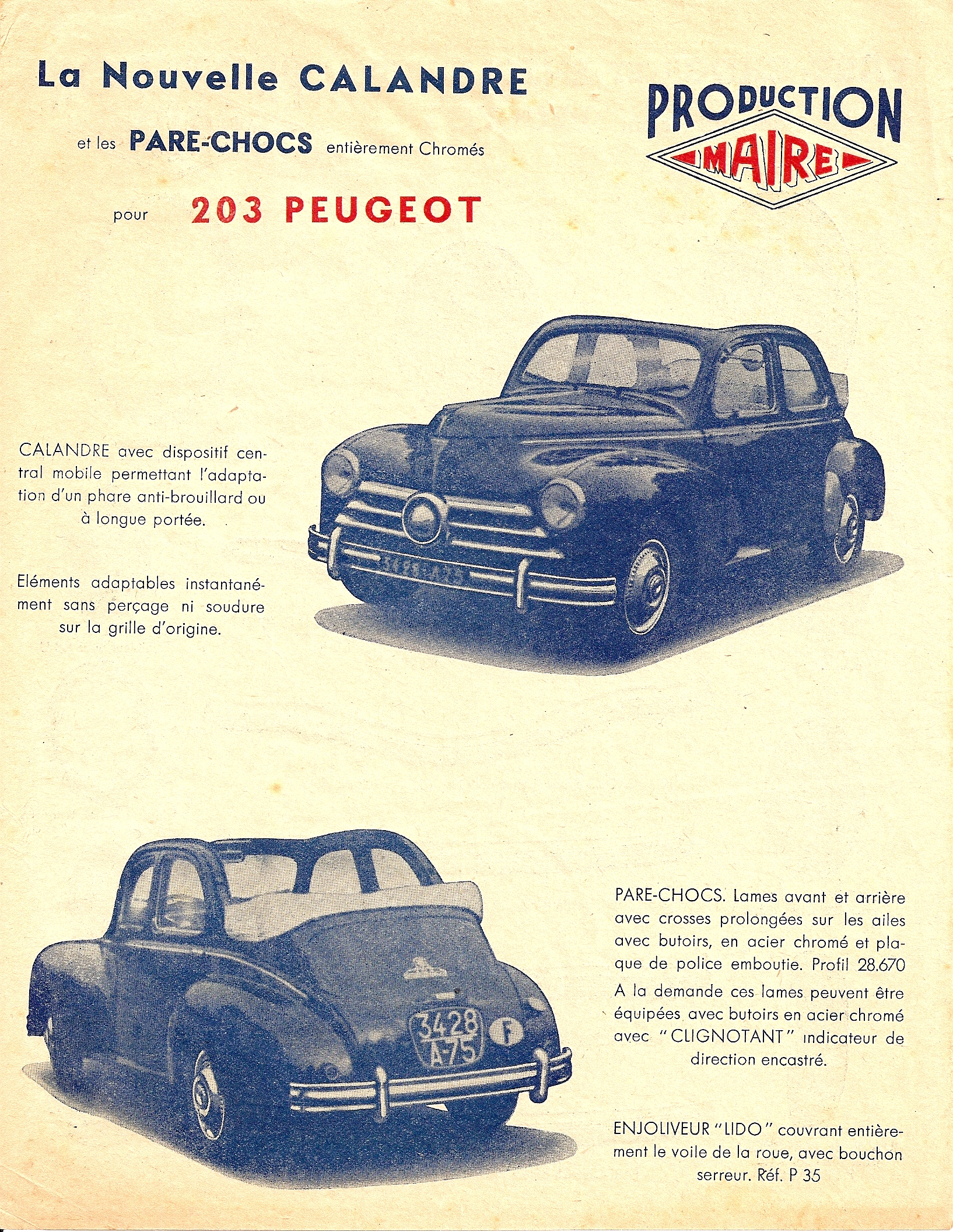 L'accessoiriste Maire s'est aussi intéressé à la Peugeot 203, proposant des calandres spéciales, ainsi que des pare-chocs et enjoliveurs, qu'il est encore possible de voir sur des 203.